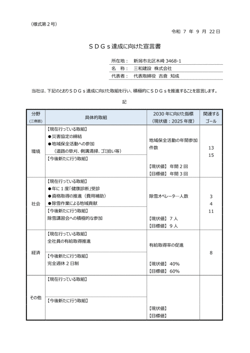 当社は社会貢献・礼儀・技術の向上・信義信頼・節約工夫を「五つの誓い」として掲げ、新潟市を中心に土木・舗装工事を行う組織であり、そのあらゆる事業活動において以下の基本方針に基づき、持続的な環境改善を推進する。